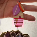 Contemporary cluster style necklace made from resin, comprising of three units in transparent magenta, opaque lilac and opaque tangerine. Each is inlaid with coloured details.