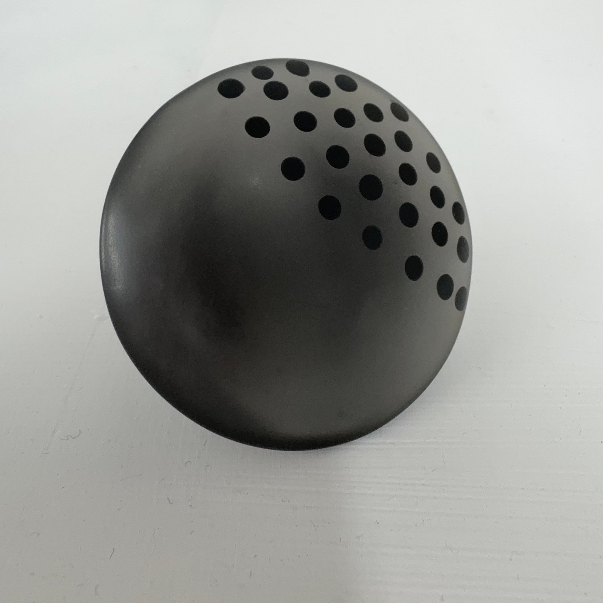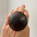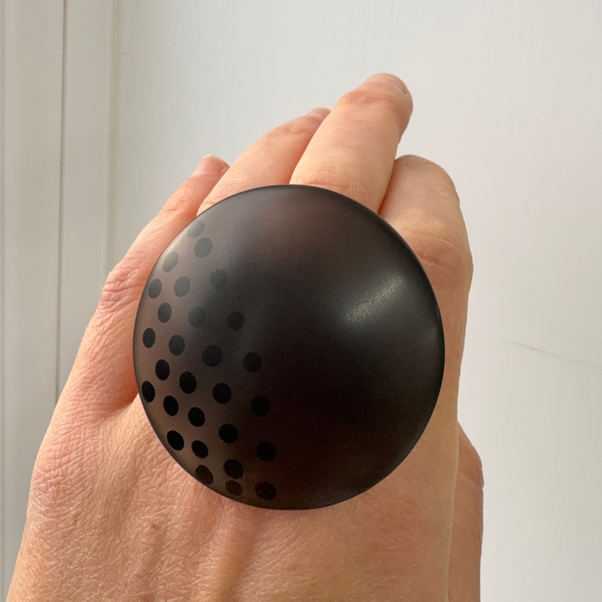 This MAXI ring is a big fun statement piece!! In smoky grey semi-translucent resin, it has opaque black dots inlaid into the surface; Each one drilled and filled by hand!
