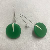 These drop earrings can be worn everyday! A tapered cream line is inlaid into opaque forrest green circle resin units. They have a soft matt finish and hang from sterling silver wire complete with silver butterfly backs.
