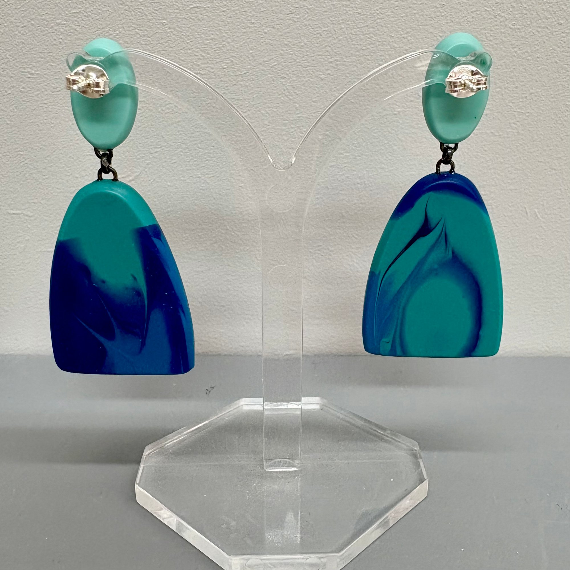 Arc shaped resin units in marbled shades of cobalt blue, mid blue and turquoise, hang from small zircon oval units. The pattern on each pair is unique due to process when casting!!