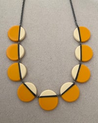 This statement necklace is made up of multiple circular resin units in shades of mustard yellow and cream, inlaid with a charcoal grey line, achieved using a 3 step inlay process. These are attached together with oxidised sterling silver findings and bolt ring.