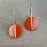 A tapered cream line is inlaid into opaque bright orange circle resin units, with a cream shadow on one half. They have a soft matt finish and hang from sterling silver wires complete with silver butterfly backs.